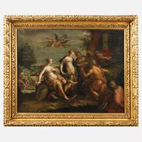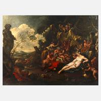 abendliche mediterrane Sommerlandschaft mit vom Wein berauschter Gesellschaft, im Zentrum lagert der alte, von Weinlaub bekrönte Gott des Weins Bacchus, umgeben von Putti, Flöte spielendem Faun und spärlich bekleideten, trinkenden und musizierenden Männern und Frauen, die mystischen, ob ihrer Zügellosigkeit und ekstatischen Hingabe an sinnliche Genüsse wie Wein, Musik, Tanz und Liebe beliebten Bacchanalien der Römer gaben im prüden und mitunter puritanischen Barock einen willkommenen Vorwand der Verbildlichung von Nacktheit und Ausgelassenheit in Form von Historiengemälden, gering pastose Genremalerei in dunkeltoniger Farbigkeit, Öl auf Leinwand und Keilrahmen, 17. Jh., unsigniert, Craquelure, mehrfach doubliert, restaurierungsbedürftig, ungerahmt, Maße ca. 80 x 107 cm.