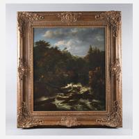 sommerlicher Blick in urwüchsige skandinavische Berglandschaft mit gischtend in Kaskaden zu Tal stürzendem Bergbach, angeregt durch seinen Lehrer Savery (welcher Tirol bereiste) beschäftigte sich Everdingen früh mit Gebirgslandschaften, der Legende nach soll Everdingen bei einer Schiffsreise nach Kopenhagen durch einen Sturm nach Norwegen abgetrieben sein und lernte hier die Gebirgswelt des Landes kennen, die fortan sein bevorzugtes Sujet werden sollte, hierzu schreibt die Allgemeine Deutsche Biographie "... daß er auch die nordische Felslandschaft der Kunst eroberte und deren Felshänge, Gießbäche und Wasserfälle, dunkle Tannenwälder, Lichtungen mit Mühlen, Holzhäusern etc. mit Vorliebe schilderte. Naturwahrheit ist für Everdingen Aufgabe der Malerei; er ward darin ein Haupt der Haarlemer Schule ...", lasierende Landschaftsmalerei, Öl auf Leinwand, um , links unten auf gemaltem Baumstamm signiert "A. van Everdingen", feine Craquelure, doubliert, restauriert, im prächtigen, ca. 17 cm breitem Goldstuckrahmen gerahmt, Falzmaße ca. 92 x 81 cm. Künstlerinfo: auch Aldert oder Allaert van Everdingen, niederländischer Landschaftsmaler, Aquarellist, Zeichner, Buchdrucker, Radierer und Sammler (1621 Alkmaar bis 1675 Amsterdam), studierte zunächst Theologie, parallel Schüler von Roelant Savery in Utrecht, weitergebildet bei Pieter de Molyn [Molijn] in Haarlem, 1640–44 Studienreise nach Schweden und Norwegen, anschließend Rückkehr nach Holland, ab 1645 Meister und Mitglied der Lukasgilde Haarlem, ab 1651 in Amsterdam tätig, 1657 Bürgerrecht von Amsterdam, Quelle: Thieme-Becker, Saur "Bio-Bibliographisches Künstlerlexikon", Allgemeine Deutsche Biographie, Müller-Singer, Seubert, Müller-Klunzinger, Nagler, Wurzbach und Wikipedia.