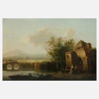 Wanderer vor antiken Ruinen in bewegter, abendlicher mediterraner Sommerlandschaft, gering pastose Malerei, hierzu bemerkt die Allgemeine Deutsche Biographie: "Norbert Grund, einer der fruchtbarsten Kleinmaler Böhmens, ... dieses ganz seltsam aus seiner zeitgenössischen Umgebung vortretenden Künstlers. Leicht tocki[e]rt, meist auf einen – neuester Zeit wieder in die Mode gekommenen – silbergrauen Hintergrund versetzt, heben sich die fein colorirten, putzigen Figürchen oder Scenerien lebensfrisch ab ...", Öl auf Holzplatte, um 1760, unsigniert, rückseitig bezeichnet "Grund", geringe Craquelure, Malplatte etwas gebaucht, Retuschen, schön im alten Rahmen mit ausgestellten Ecken gerahmt, Falzmaße ca. 10,5 x 15 cm. Künstlerinfo: eigentlich Norbert Joseph Carl Grund, irrtümlich auch Gründ, böhmischer Maler (1714 oder 1717 Prag bis 1767 Prag), Sohn und bis 1737 Schüler seines Vaters Christian Grund (ca. 1686–1751, Hofmaler des Grafen Norbert Vincenz Kollowrat-Liebsteinsky, welcher als Pate Norbert Grund mäzenatisch förderte), ab 1738 in Wien beeinflusst durch Werke des Malers und Radierers Franz de Paula Ferg, Wanderschaft durch Italien (Venedig) und Deutschland (Würzburg, Seinsheim), wohl 1741 Rückkehr nach Prag, ab 1752 Mitglied und Meister der Malerzunft der Prager Kleinseite, ab 1753 deren Prinzipal, Quelle: Thieme-Becker, Saur "Bio-Bibliographisches Künstlerlexikon", AKL, Dlabacž "Allgemeines historisches Künstler-Lexikon für Böhmen und zum Theil auch für Mähren und Schlesien", Wurzbach, Nagler, Allgemeine Deutsche Biographie, Neue Deutsche Biographie, Bénézit, Seubert, Müller-Singer und Wikipedia.