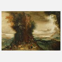 auf einer Bergkuppe thronender Wachturm hinter Bäumen, in weiter Sommerlandschaft, zu Füßen des Turmes vielfigürliche Staffage wie Ritter zu Pferd, Landsknechte mit Hellebarden und Hunden, effektvolle, mit spitzem Pinsel lasierend erfasste Malerei, Öl auf Kupferblech, wohl 17. Jh., unsigniert, rückseitig neuzeitliches Etikett mit ungeprüfter Zuschreibung "Mozart, Anton (Augsburg 1573–1625) ...", Malgrund gering wellig, restauriert, gerahmt, Falzmaße ca. 27 x 39 cm. Künstlerinfo: auch Motzhart, dt. Maler (1572 oder 1573 bis 1625 Augsburg), Sohn und ab 1587 Schüler des Malers Christoph Mozart, wohl beeinflusst von Lucas van Valckenborch und Jan Brueghel dem Älteren, erhielt 1598 das Meisterrecht in Augsburg und betrieb hier 1602–23 eine Lehrwerkstatt, erlangte Berühmtheit für seine Gemälde des 1615/16 entstandenen Pommerschen Kunstschranks für Herzog Philipp II. von Pommern, tätig in Augsburg, Quelle: Thieme-Becker, Saur "Bio-Bibliographisches Künstlerlexikon", Müller-Singer, Seubert, Müller-Klunzinger, Nagler, Nagler Monogrammisten, Stadtlexikon Augsburg, Bénézit und Wikipedia.