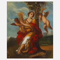thronende römische Göttin der Fruchtbarkeit und des Ackerbaus Ceres mit Getreidebündeln vor sommerlicher Landschaft von Putti umgeben, pastose Genremalerei, Öl auf Leinwand und Keilrahmen, wohl 17./18. Jh., unsigniert, alt doubliert und restauriert, rückseitig altes biedermeierliches Etikett "... Paris", restaurierungsbedürftig, ungerahmt, Maße ca. 58 x 47 cm.