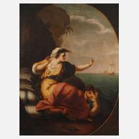 die Szene erzählt die mythische Geschichte der Tochter des kretischen Königs Minos, dessen Sohn Androgeos soll von Athenern getötet worden sein, als Rache unterwarf Minos Athen und forderte alle neun Jahre sieben Jünglinge und sieben Jungfrauen als Menschenopfer für den von ihm in einem Labyrinth auf Kreta gefangenen Minotauros, als erneut ein Opfer fällig war, reihte sich der athenische Königssohn Theseus unter die Verdammten, um den Minotauros zu besiegen, auf Kreta angelangt, verliebte sich Ariadne in Theseus und half ihm Minotauros zu töten, anschließend flüchtete sie mit ihrem Geliebten auf die Insel Naxos, hier verließ Theseus Ariadne heimlich, im vorliegenden Gemälde sieht man nun die gerade erwachte Ariadne trauernd und entsetzt hinter dem davonsegelnden Schiff des Theseus hinterherblickend, fein lasierende, freie Kopie nach dem vor 1782 entstandenen Gemälde von Angelika Kauffmann (1741-1807) als hochovales Motiv mit passepartoutartig gemalten Ecken ausgeführt, Öl auf Leinwand, 19. Jh., unsigniert, Craquelure, geringe Altersspuren, in Berliner Leiste gerahmt, Falzmaße ca. 90,5 x 70,5 cm.