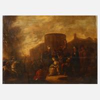 vornehme, teils orientalisch gekleidete Gesellschaft vor Stadtkulisse, die Ankunft des links auf einem weißen Ross eintreffenden Alexanders des Großen erwartend, lasierende barocke Genremalerei mit wenigen pastosen Effekten, Öl auf Holzplatte, um 1600, unsigniert, Malplatte nach Bruch neu zusammengefügt, restaurierungsbedürftig, ungerahmt, Maße ca. 40 x 53 cm.