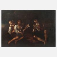 Mädchen und zwei Knaben in dämmriger Landschaft auf der Erde sitzend, ins Kartenspiel vertieft, gering pastose Malerei in dunkeltoniger Farbigkeit mit effektvollem Licht, Öl auf Leinwand, wohl um 1700, unsigniert, Craquelure, doubliert, restauriert, alt gerahmt (Eckverbindungen gelockert), Falzmaße ca. 110 x 160 cm.