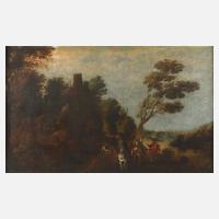 stürmische Sommerlandschaft mit Burg auf hohem Fels, im Vordergrund reitet ein herrschaftliches Paar des Wegs auf den Betrachter zu, begleitet von einem Bettler und einem Jäger, gering pastose barocke Malerei, Öl auf Leinwand, 18. Jh., unsigniert, Craquelure, Fehlstelle in der Leinwand, doubliert, alt restauriert, restaurierungsbedürftig, gerahmt, Falzmaße ca. 74 x 118 cm.