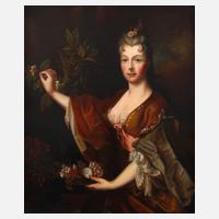Portrait einer edel und elegant gekleideten Dame beim Blumenpflücken, den Betrachter anblickend, historisierende Malerei, Öl auf Leinwand, 2. Hälfte 20. Jh., links unten bezeichnet und signiert "cop. (kopiert) Maximilian Vollert", in durchbrochen gearbeiteten und bronzierten Stuckrahmen gerahmt, Falzmaße ca. 101,5 x 85,5 cm. Künstlerinfo: dt. Bankkaufmann und Maler (1908 Marienberg bis 1988 Leipzig), bis in die 1930er Jahre im erlernten Beruf tätig, autodidaktische Hinwendung zur Malerei, nach Kriegsdienst 1945 freiberuflicher Maler, tätig in Leipzig ab 1946, regelmäßige Aufenthalte im Sommerhaus in Machern, Quelle: Prof. Mielke/Uni Leipzig und Internet.