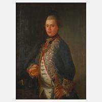 Halbfigurenbildnis eines herrschaftlichen jungen Mannes mit Perücke, im aufwendig bestickten und spitzenbesetzten Uniformrock mit Ringkragen, die linke Hand des Dargestellten ruht auf einem Degen mit Portepee im Gehänge, während die rechte Hand zum Bildbetrachter zeigt, neben ihr ist ein Dreispitz auf einem Tisch "Chapeau bas" liegend dargestellt, rückseitig auf älterem Schild bezeichnet "von Stetten", somit wohl ein Angehöriger des fränkischen Adelsgeschlechtes derer von Stetten, welche hochrangige Militärs in Baden, Bayern und Österreich stellten, effektvolle, gering pastose Portraitmalerei, Öl auf Leinwand, links unten Signaturreste und undeutlich datiert "J. M ... 1775", Craquelure, alt restauriert, doubliert und auf neuen Keilrahmen aufgezogen, restaurierungsbedürftig, original gerahmt, Falzmaße ca. 104,5 x 78 cm.