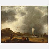 Gruppe von Männern am Strand, beim Entladen eines Schiffes, unter dramatisch bewölktem Himmel, teils mit spitzem Pinsel ausgeführte Malerei, Öl auf Leinwand, feines Craquelure, in Rahmen des 19. Jh. gerahmt, Falzmaße 27 x 32,5 cm.