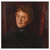 Bildnis einer dunkel gekleideten Frau vor dunkelrotem Stoff, gütlich in die Ferne blickend, leicht pastose Portraitmalerei, Öl auf Leinwand, rechts unten Ritzsignatur und Datierung "A Becher (19)05", Craquelure, hinterlegte Stelle, Retuschen, gerahmt, Falzmaße 56 x 56 cm.