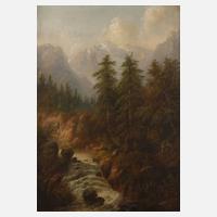 Blick in imposante sommerliche Hochgebirgslandschaft, mit Angler am Sturzbach, gering pastose Landschaftsmalerei, Öl auf Leinwand, um 1880, rechts unten signiert "E. BOEHM.", rückseitig altes handschriftliches Künstleretikett "Gebirgsbach aus der Schweiz", Craquelure, hinterlegte Fehlstelle in der Leinwand retuschiert, gering restaurierungsbedürftig, original im prächtigen, ca. 19 cm breiten Goldstuckrahmen mit Messingrahmenschild "E. Boehm" gerahmt, Falzmaße ca. 100 x 74 cm. Künstlerinfo: auch Eduard Böhm, österreichischer Landschaftsmaler (1830 Wien bis nach 1890 ebenda), Sohn des Kupferstechers Johannes Boehm (1774 Wien bis 1841 ebenda) und Schüler seines gleichnamigen älteren Bruders und Landschaftsmalers Johannes Boehm (erwähnt 1801 bis 1850 in Wien), tätig in Wien, Quelle: Bénézit, Müller-Singer, AKL, Saur Bio-Bibliographisches Künstlerlexikon und Internet.