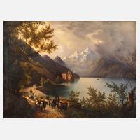 sommerliche Ansicht des Genfersees mit der berühmten, mittelalterlichen Wasserburg "Schloss Chillon [frz.: Château de Chillon]" und Villeneuve im Hintergrund, vor der Kulisse der abstrahiert wiedergegebenen "Dents du Midi [dt. Zähne des Südens]" genannten Bergkette der Walliser Alpen, während auf dem See Segelboote und ein Dampfschiff ihre Bahn ziehen, einem Schornstein des Schlosses gemächlich Rauch entsteigt, treiben Hirten ihre Herde auf staubiger Uferstraße dem Bildbetrachter zu, das Gemälde besticht durch seine dramatische Komposition, während links der Weg mit dem Schloss Chillon und die Alpengipfel im warmen Licht der späten Sonne leuchten, braut sich rechts mit tief hängenden, grau-violetten Wolken ein unheilvolles Gewitter zusammen und ein abgebrochener Baum rechts im Vordergrund kündet von Stürmen vergangener Tage, der Künstler verbildlicht so gekonnt die Naturgewalten, deren ambivalente Erscheinungen das Leben bestimmen, Reinhard Wegner vermerkt zum Künstler "... Der Maler Johann Anton Castell gehört jener Generation Dresdner Künstler an, die auf die berühmten Begründer der romantischen Malerei Philipp Otto Runge, Caspar David Friedrich und Carl Gustav Carus folgten. ... Mit den sorgfältig komponierten und fein ausgeführten Landschaften gehörte er um die Mitte des 19. Jahrhunderts zu den gefragten und bedeutenden Malern der Dresdner Romantik. ...", stimmungsvolle, lasierende, teils gering pastose Malerei in fein abgestimmter Farbigkeit, Öl auf Leinwand, um 1840, für Castell ist in der Literatur keine Reise nach Frankreich, Italien oder der Schweiz belegt – dennoch entstanden 1841 ein Gemälde vom Comer See "Lago di Como" und ein Gemälde vom Rheinfall bei Schaffhausen, links unten ligiert signiert "JACastell", alt doubliert, etwas restaurierungsbedürftig, in alter Goldstuckleiste in Zweitverwendung gerahmt, Falzmaße ca. 59 x 79 cm. Künstlerinfo: auch Johann Anton Castelli, dt. Landschaftsmaler und Kopist (1810 Dresden bis 1867 Dresden), studierte 1827–28 an der Akademie Dresden, ab 1829 Weiterbildung bei Johan Christian Clausen Dahl in Dresden, unternahm Studienreisen durch Böhmen, das Salzkammergut (1831) und Tirol sowie nach Wien, beeinflusst von Caspar David Friedrich, beschickte die Dresdner Akademieausstellungen, tätig in Dresden, Quelle: Thieme-Becker, AKL, Saur "Bio-Bibliographisches Künstlerlexikon", Schülerlisten der Dresdner Akademie, Boetticher, Bénézit und Wikipedia.