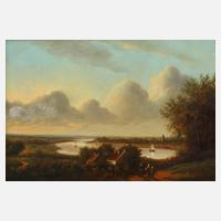 sommerlicher Blick von einer Anhöhe auf Stadtkulisse am Fluss, eventuell Ansicht von Arnhem [dt.: Arnheim] am Nederrijn, stimmungsvolle, lasierende, partiell gering pastose Landschaftsmalerei, Öl auf Leinwand, um 1830, rechts unten unleserlich signiert "A. Co...", rückseitig niederländische Info aus Scheen zu Abraham Johannes Couwenberg und holländisches Kunsthandelsetikett Rijswijk, geringe Craquelure, wachsdoubliert, etwas restauriert, etwas restaurierungsbedürftig, schön mit Messingrahmenschild gerahmt, hier ungeprüfte Zuschreibung "1806 A. J. Couwenberg J.ZN 1844 – Arnhem", Falzmaße ca. 34 x 48 cm. Künstlerinfo: auch Jzn. Couwenberg, niederländischer Maler, Aquarellist, Zeichner, Lithograph, Radierer und Schriftkünstler (1806 Delft bis 1844 Arnhem [dt. Arnheim]), Schüler der Haager Zeichenakademie und der Akademie Amsterdam, weitergebildet bei Anthony Jacobus Offermans, beschickte ab 1821 Ausstellungen in Den Haag und ab 1825 in Haarlem, ab 1834 tätig als Zeichenlehrer eines Kunstvereins in Arnhem, Zusammenarbeit mit Charles Rochussen, dessen Landschaften er staffierte, Mitglied der Königlichen Kunstakademie Amsterdam, tätig erwähnt in Arnhem und Renkum-Oosterbeek, Quelle: Thieme-Becker, Saur "Bio-Bibliographisches Künstlerlexikon", AKL, Scheen, Info Rijksbureau voor Kunsthistorische Documentatie, Bénézit, Wurzbach, Scheen, Müller-Singer, Seubert, Müller-Klunzinger und niederländische Wikipedia.