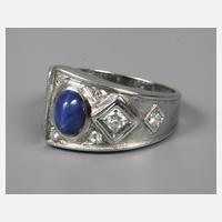 um 1990, Weißgold gestempelt 14 K = 585/1000, ca. 13 mm hoher Ringkopf, besetzt mit einem Brillanten von ca. 0,1 ct, einem ovalen Sternsaphircabochon sowie acht Achtkantdiamanten, leichte Tragespuren, RW 19 mm, G ca. 6,4 g.