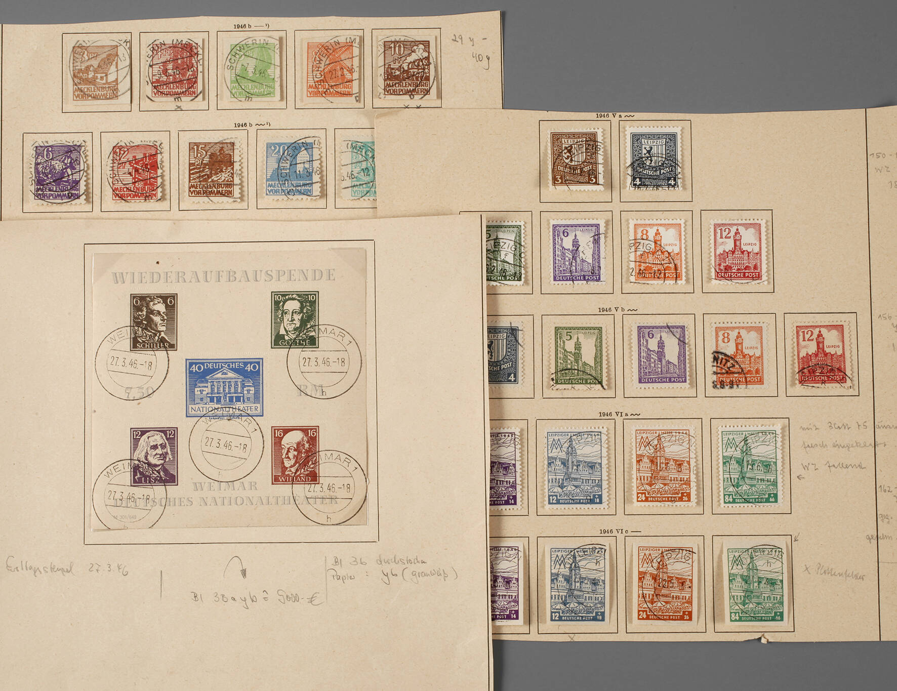 Michel 111, Block 3b, Wiederaufbauspende Deutsches Nationaltheater Weimar, mit Ersttagsstempel 27.3.46, Zickzackzähnung; Mecklenburg-Vorpommern, Satz Kinderhilfe 1945 gestempelt; Satz Bodenreform 1945 gestempelt; Satz Abschiedsserie 1946 gestempelt; Leipzig, Satz Abschiedsserie 1946 gestempelt (in zwei Farbtönen); zweimal Satz Leipziger Messe 1946 (gezähnt und ungezähnt).