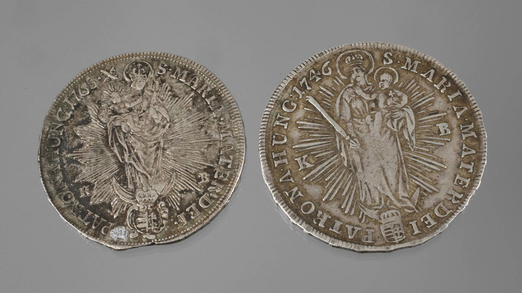 römisch-deutsches Reich Habsburg, Silbertaler von 1746, G ca. 14,3 g, ss+ und 1765, G ca. 14 g, s+, Avers Maria Theresia, Kopf nach rechts, Revers Mondsichelmadonna mit Jesuskind, Reichsapfel und Schwert über ungarischem Wappen.