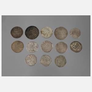 darunter 24 einen Taler Brandenburg Preußen 1756 L, ss; 24 einen Taler Sachsen-Polnisch-Litauischer Staatenbund 1756, ss; 24 einen Taler Sachsen 1765, ss; 12 einen Taler Sachsen 1763, ss; 12 einen Taler Sachsen-Polnisch-Litauischer Staatenbund 1736, ss++; dazu achtmal 2 Kreuzer Elsas, Worms um 1600, s, alle Münzen aus Silber.