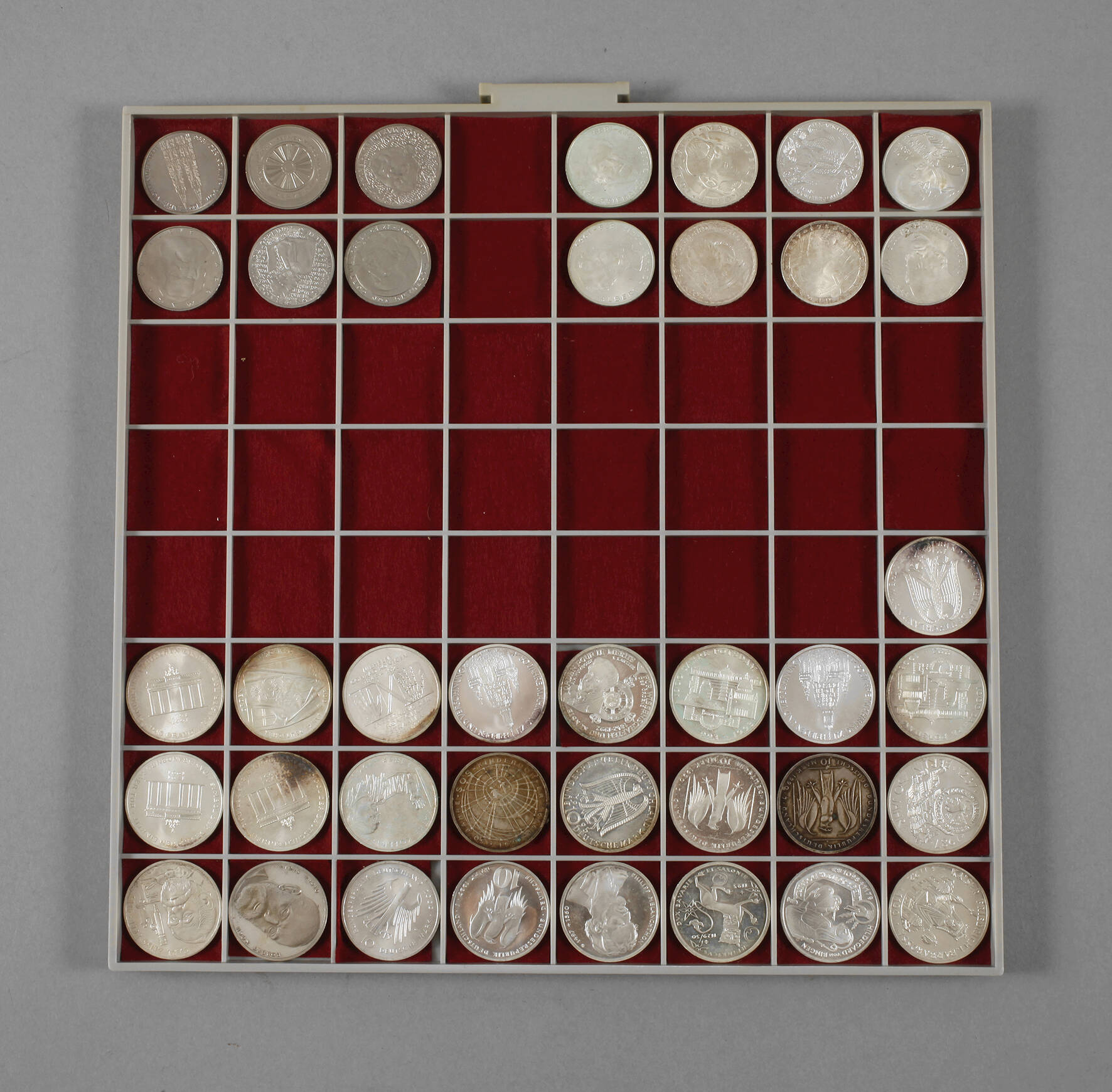25 Stück à 10 DM, darunter Barbarossa, Robert Koch, Brandenburger Tor, Röntgen, Frauenkirche, Carl Zeiss..., sowie 14 Stück à 5 DM, darunter Mercator, Pettenkofer, Kant, Gauß, Goethe, Karl Marx..., alle ss-vz.