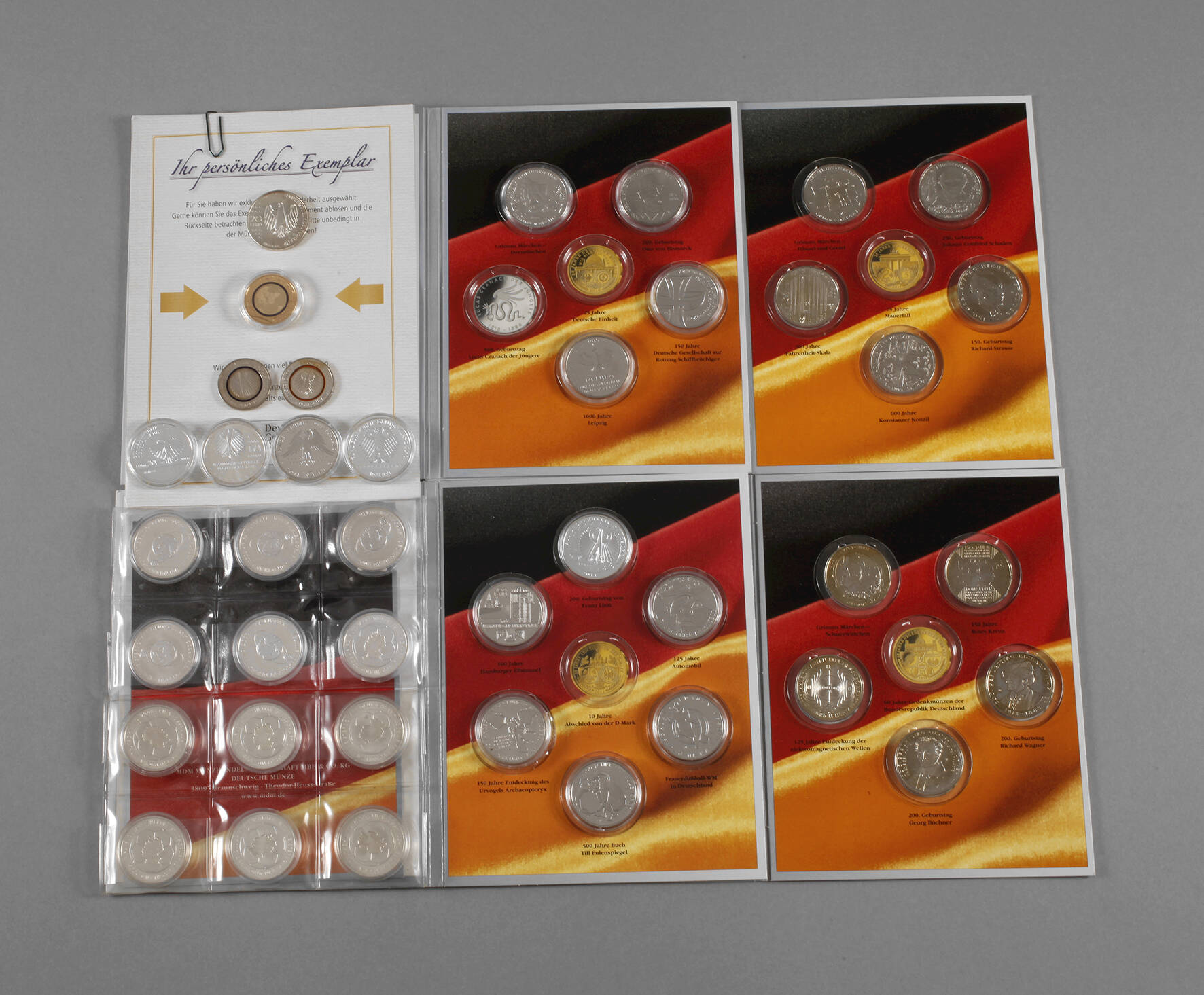 Gedenkmünzen zu 405 Euro, davon 35 x 10 Euro mit 12 Stück Fußball WM 2006; zweimal 20 Euro; zweimal 5 Euro Planet Erde 2016 J, davon einer vergoldet und einmal 5 Euro 2018 F Subtropische Zone, alle prägefrisch, teilweise in Kapsel.