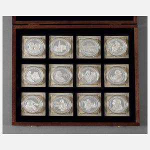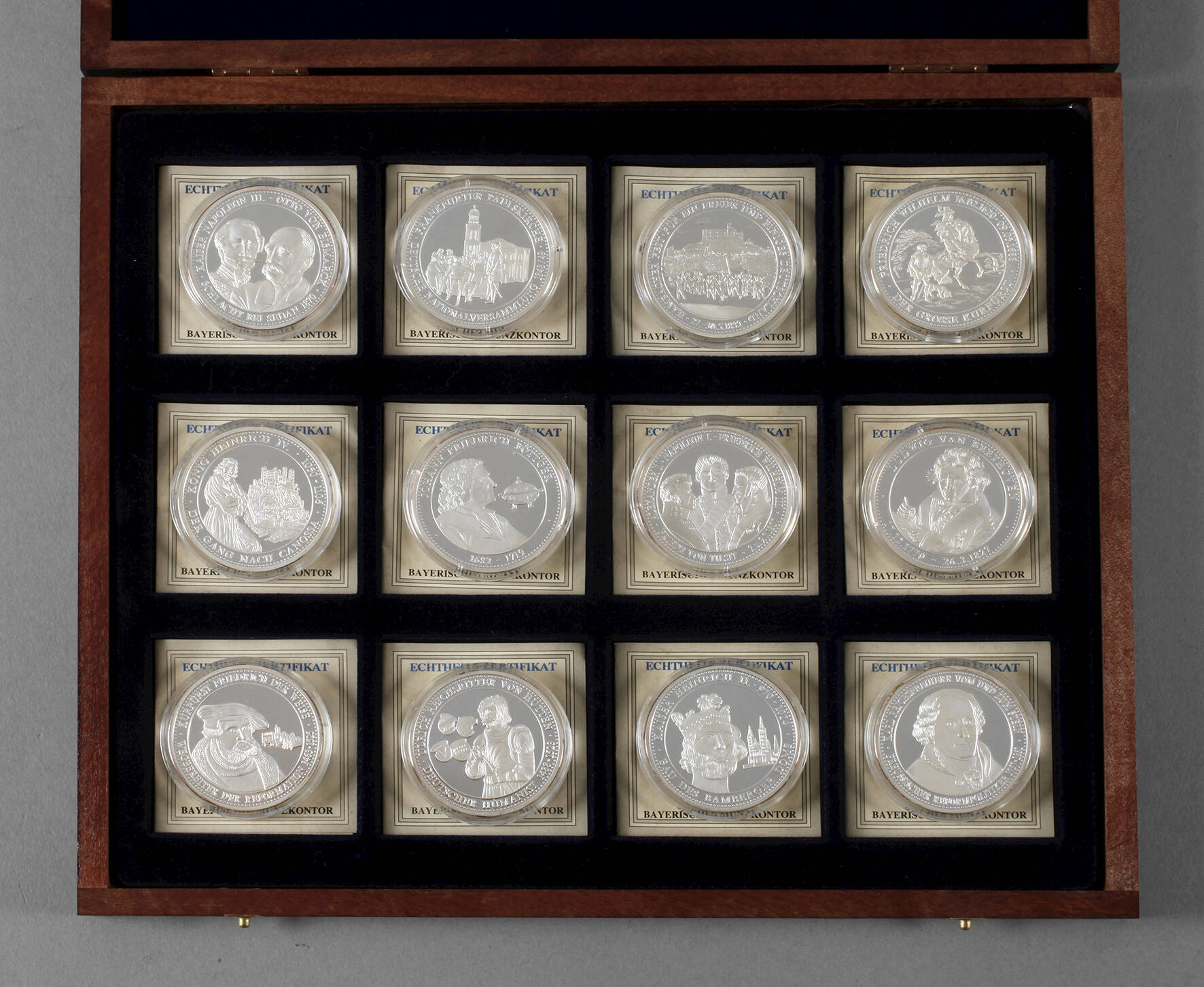 zwölf Medaillen, Silber 999, G ca. 19,8 g, deutsche Geschichtsmotive, darunter Schlacht bei Sedan 1870, Friedrich der Weise, Ludwig van Beethoven, Kaiser Heinrich, Hambacher Fest...; Avers alle mit Eichbaum, PP, in Kapsel, in repräsentativer Holzkassette.