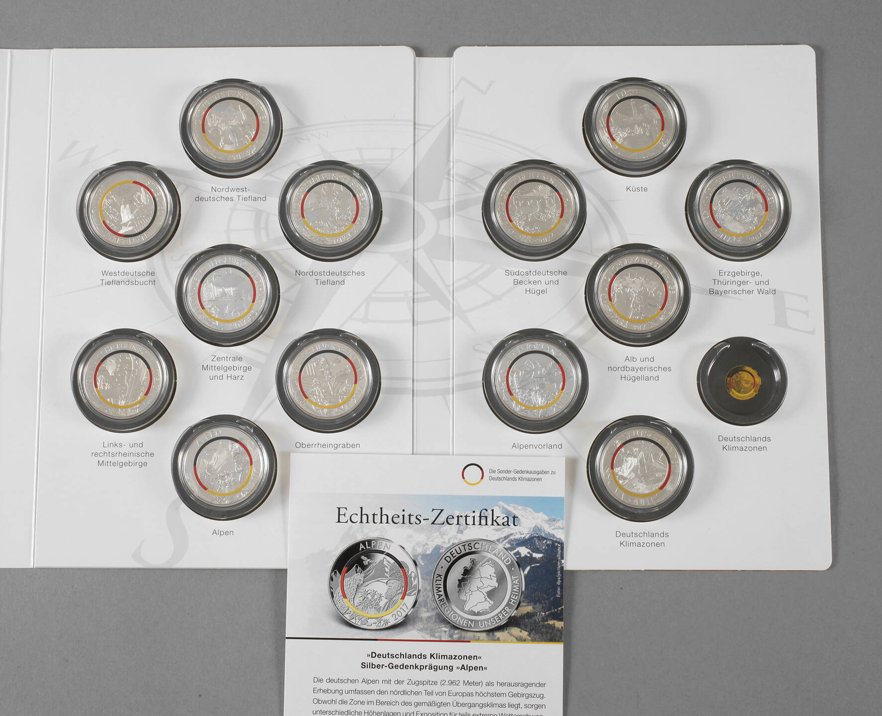 dreizehn Stück Medaillen, Silber 333, G ca. 14,66 g, mit Motiven deutscher Klimazonen, darunter Oberrheingraben, Alpen, Küste, Erzgebirge..., mit Farbringveredelung, PP, in Kapsel, in Sammelblister mit Zertifikat.