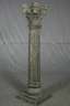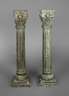 wohl 20. Jh., aus massivem Hartholz gefertigt, kannelierte Säule auf quadratischem Stand mit geschnitztem korinthischen Kapitell, grau-grün gefasst und patiniert, Maße je 149 x 40 x 40 cm.