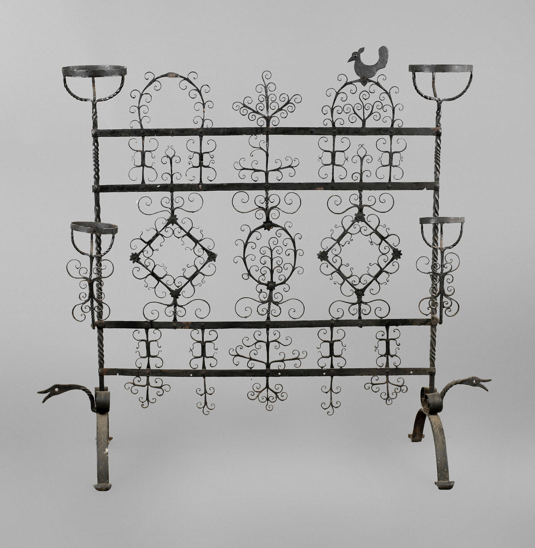 19. Jh., feine Kunstschmiedearbeit, reich verziert mit Floralmotiven, Bekrönung mit zwei Vögeln (einer fehlt), eine kleine Fehlstelle, oberflächliche Gebrauchsspuren, Maße 105 x 103 x 38 cm.