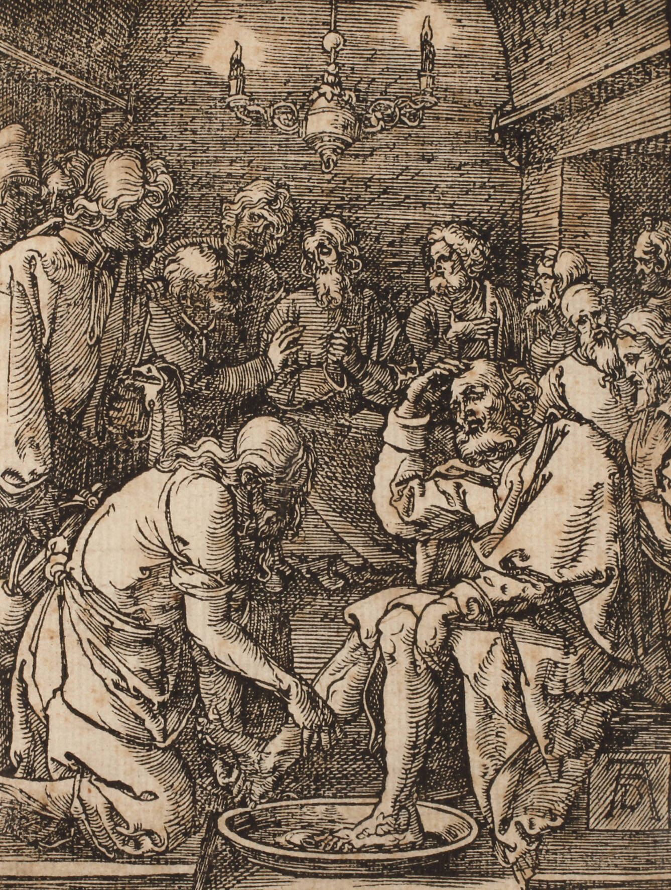 von oder nach Albrecht Dürer, Blatt 9, „Die Fußwaschung“, Holzschnitt, rechts unten ligiertes Monogramm „AD", an einer Seite in die Einfassungslinie beschnitten, leicht braunfleckig, kleiner Einschnitt, unter Passepartout montiert, Blattmaße ca. 12,5 x 9,6 cm. Künstlerinfo: bedeutender dt. Maler, Kupferstecher, Holzschnittzeichner und Kunstschriftsteller (1471 Nürnberg bis 1528 Nürnberg), Schüler seines Vaters als Goldschmied, 1486-90 Lehre und Mitarbeiter beim Maler Michael Wohlgemut, 1490-94 Wanderschaft an den Oberrhein, 1494 erste Italienreise, ab 1501 mit Hans Schäuflein, Hans Baldung Grien und Hans von Kulmbach eigene Werkstatt in Nürnberg, 1505 Reise nach Venedig, 1518 Vertreter der Stadt Nürnberg auf dem Reichstag in Augsburg, 1520-21 Reise über Mainz, Frankfurt am Main und Köln nach Antwerpen, leitete anschließend die Ausstattung des Nürnberger Rathauses, Quelle: Thieme-Becker, Wikipedia und Internet.