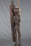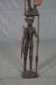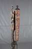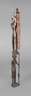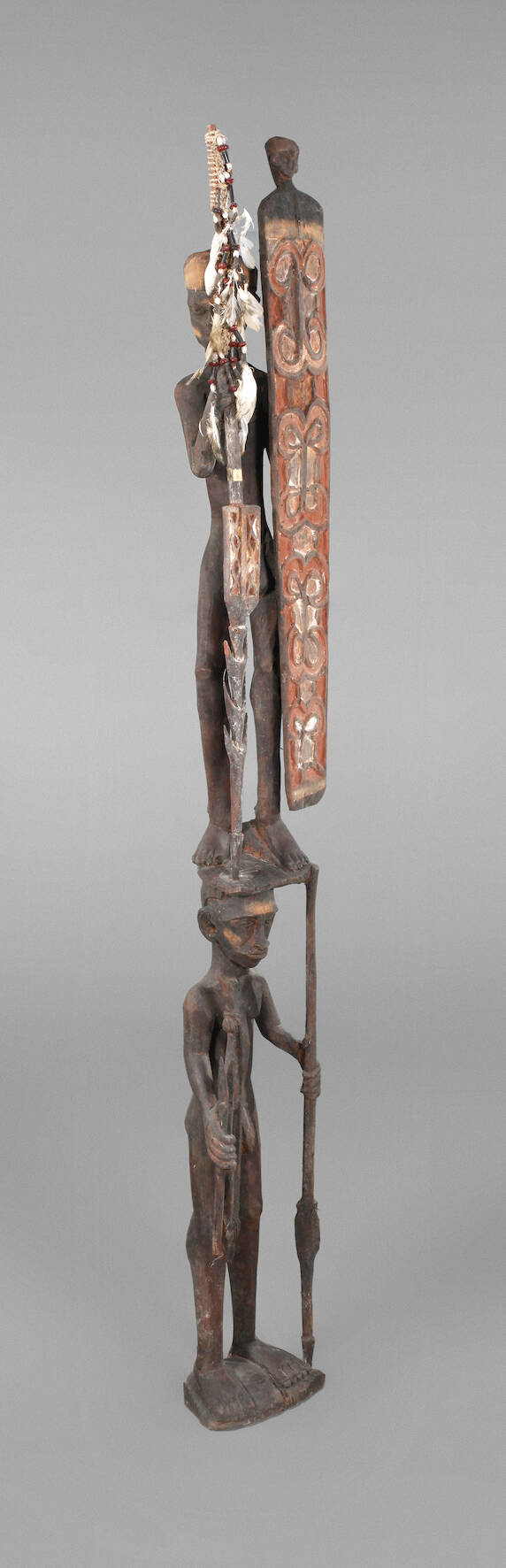 20. Jh., Tropenholz dunkel gefasst bzw. farbig staffiert und beschnitzt, in zwei Ebenen übereinander angeordnete Figuren mit Speer und Schild, verziert von Federn und Perlen, Altersspuren, H 147 cm.