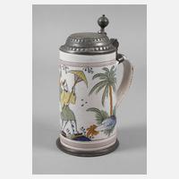 um 1720, zylindrischer Walzenkrug, Steinzeug ockergelb glasiert, gemodelter Dekor aus Blattmotiven, partiell blau bemalt, Zinnmontierung mit Standfuß, Lippenrand, Deckel mit hohlem Kugeldrücker sowie einem Gurtfurchenband, Deckel innen gepunzt Meister Johann Tobias Möhrling aus Gotha (ab 1712 als Meister in Rudolstadt), sehr gute Erhaltung, H 23 cm.