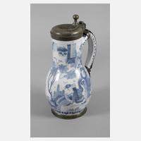 De Paeuw, auf dem Deckel datiert 1692, am Boden Malermonogramm Gerrit Pietersz Kam, hellbrauner Fayencescherben weißlich glasiert, Bemalung in Kobaltblau, umlaufend figürliche Chinoiserien in Landschaft, Deckelmontierung über Henkelband mit dem Standring verbunden, Deckel mit eingelassener Medaille mit verschiedenen Herrscherportraits und graviertem Besitzermonogramm CH, Glasur am Henkel mit alter Ausbesserung, Alters- und Gebrauchsspuren, H 28 cm.