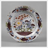 wohl Delft, 18. Jh., hellbrauner Scherben weißlich glasiert, polychromer Seelandschaftsdekor mit Libelle, Brand mit Glasurfehlstellen, D 35 cm.