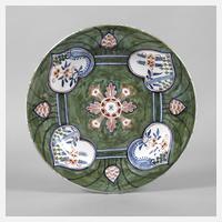 18./19. Jh., rückseitig Pinselmarke AR ligiert, hellbrauner Fayencescherben, auf moosgrünem Fond herzförmige Kartuschen in Eisenrot und Kobaltblau, Rand mit winzigsten Glasurfehlstellen, sonst guter Zustand, D 25,5 cm.