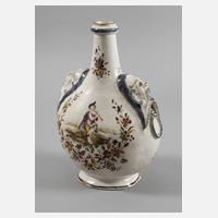 Italien, Mitte 18. Jh., hellgrauer Fayencescherben weißlich glasiert, beidseitig mit polychromer Blumenmalerei verziert, frontseitig flötespielender Jüngling, die Schulter mit zwei großen, hohl aufgelegten Maskaronen, zwei Chips am Standring, sonst guter altersgemäßer Zustand, H 31 cm.