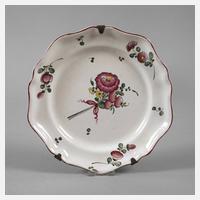 1. Hälfte 19. Jh., ungemarkt, Scherben weißlich glasiert, geschweifte, leicht gemuldete Form mit polychromer Blumenmalerei und purpurfarbener Randlinie, kaum sichtbarer Glasurriss auf der Fahne, D 22 cm.