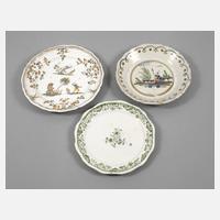 meist 18. Jh., einer Venetien, die anderen beiden nicht zugeordnet, Teller mit Chinoiserie mit langem Riss, rückseitig alt geklammert und Sammlungsnummer, Teller Venetien im Renaissancestil, mit figürlicher Staffage und in sehr gutem Zustand, die anderen mit Glasurfehlstellen, D zweimal je 22 cm und einmal 24,5 cm.