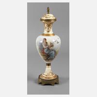 Ende 19. Jh., blau gepinselte Sèvres-Imitationsmarke mit Zusatz "S.....", Fayence mit feiner polychromer Unterglasurbemalung und Reliefgoldmalerei, mehrteilig verschraubte Balusterform, der ovoide Korpus mit schauseitiger Darstellung einer elfenhaften jungen Frau mit Blumenkorb in idealisierter Landschaft, signiert Bernier, sowie rückseitigem Brückenmotiv, am Fuß, Hals und Stülpdeckel Rocaillekartusche mit umlaufenden Blumenranken, fünfteilige Messingmontur mit Perlstabzier und Zapfenknauf, Goldränder berieben und Glasur craqueliert, H 34 cm.
