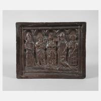 wohl 16. Jh., Irdenware braun glasiert, rechteckige Form, reliefierte Darstellung Maria mit Jesusknaben, flankiert von je zwei Heiligen und Bischöfen, Abplatzungen im Randbereich restauriert, Maße 27 x 22 x 3 cm.