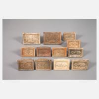 wohl um 1600, zwölf kleinformatige unglasierte Kacheln aus sandfarbenem bzw. rötlichem Scherben, zwei davon mit Portraitdarstellung, teilweise mit kleineren Fehlstellen, Maße 9,5 x 7 cm und 9,5 x 13,5 cm.