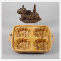 19. Jh., Irdenware honiggelb glasiert, Vertiefungen je mit einem reliefierten Hummer, dazu kleine Lammform unbestimmter Herkunft, guter Zustand, L 32 und 20 cm.