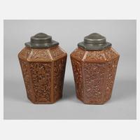 Raeren/Frechen, 1. Hälfte 18. Jh., graues Steinzeug braun glasiert, oktogonaler Korpus mit floralem Dekor und Vogelmotiv im Rapport, Hals mit Zinnmontierung, Schraubdeckel und luftdichter Innendeckel, guter Zustand, H je 17 cm.