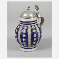um 1700, graues Steinzeug salzglasiert und blau bemalt, bauchige Wandung umlaufend mit gemodeltem Dekor aus Wellenbändern und Rosetten im Rapport, originaler Zinndeckel mit Palmettendrücker, kleine Fehlstelle am Lippenrand, sonst gut erhalten, H 18 cm.