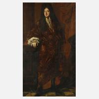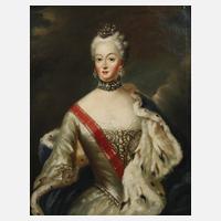 Halbfigurenbildnis einer jungen Frau mit Perücke in herrschaftlichem schulterfreien Kleid und üppigem Schmuck, im Hermelinmantel, vor dramatisch bewölktem Himmel, wohl Darstellung der Maria Antonia von Bayern (1724-1780) oder ihrer Schwester Maria Josepha von Bayern (1739-1767), effektvolle, gering pastose Portraitmalerei des Rokoko in kraftvoller Farbigkeit, Öl auf Leinwand, rückseitig auf der Leinwand wohl signiert "Deesmaréss [sic.]" und undeutlich datiert "f. [fecit] 1754" oder "f. 1764", Craquelure, teilweise hinterlegte Fehlstellen in der Leinwand, restauriert, etwas restaurierungsbedürftig, gerahmt, Falzmaße ca. 88,5 x 70,5 cm. Künstlerinfo: eigentlich George de Marées, auch Georges, Georgius oder Georg de Marees, des Marees, des Marés, Desmarée, Desmarees oder Deesmaréss, dt.-schwedischer Miniatur-, Genre- und Portraitmaler des Rokoko (1697 Gimo [Gimoby/Upland in Schweden] bis 1776 München), entstammt einer französischstämmigen Hugenottenfamilie, Sohn des Verwalters der Eisenwerke in Gino und Österbybruk in Schweden, Jean de Marées, nach dem frühen Tod der Eltern ca. 1700 Übersiedlung nach Stockholm zum Bruder der Mutter, Peter Martin van Meytens dem Älteren (1675-1736) und ab ca. 1710 Schüler in dessen Malschule, 14 Jahre dessen Mitarbeiter, schuf hier vor allem Portraits des königlich schwedischen Hauses und des Hochadels, ab 1720 teilweise als Maler freischaffend, ab 1724 Studienreise über Amsterdam zum Bruder Abraham de Marées nach Nürnberg, hier 10 Monate Schüler der Zeichenakademie unter Johann Daniel Preißler und Freundschaft zu Johann Kupetzky, 1725 Reise über Augsburg, München, Innsbruck, Padua nach Venedig, hier Schüler von Giovanni Battista Piazzetta, in Venedig beeinflusst von Rosalba Carriera (1675-1757) und Jacopo Amigoni (1682-1752), zeitweise in Rom, 1727-28 Rückkehr über Nürnberg nach Augsburg, 1730 Berufung durch Kurfürst Karl Albrecht von Bayern an den Wittelsbacher Hof nach München und Ernennung zum kurfürstlichen Hofmaler, betrieb hier eine große Werkstatt und erhielt in der Folge zahlreiche Portraitaufträge des bayerischen Hofes und der bayerischen Aristokratie, 1743 Tod der Ehefrau und fortan neben München für zahlreiche Fürstenhöfe wie den Kölner Kurfürsten Clemens August I. von Bayern in Bonn tätig, 1745-49 und 1753-56 am Bonner Hof, 1752-53 am Hof des Landgrafen Wilhelm von Hessen-Cassel, 1754 Rückkehr nach München, 1763 am fürstbischöflichen Hof zu Würzburg und Bamberg, 1767 tätig für den Kurfürst von Mainz, schuf auch Altarbilder für Klöster und Kirchen wie die Münchner Theatinerkirche, Quelle: Thieme-Becker, Saur "Bio-Bibliographisches Künstlerlexikon", Müller-Singer, Seubert, Müller-Klunzinger, Nagler, Grieb, Bénézit und Wikipedia.