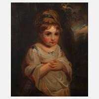 kleines Mädchen mit vor der Brust verschränkten Armen und Körbchen mit Erdbeeren, interessiert den Betrachter anblickend, leicht abgewandeltes Motiv des um 1772 entstandenen Erdbeermädchen von Joshua Reynolds, so ist auf unserem Gemälde zum Beispiel das Körbchen anders geformt, die Schleifen weisen Differenzen auf und der Bildausschnitt wurde etwas anders gewählt, Malerei mit schöner Behandlung des Lichts, Öl auf Leinwand, wohl 18. Jh., rückseitig Zuschreibung "from Sir Joshua Reynolds" (von Joshua Reynolds) und betitelt "Strawberry Girl" (Erdbeermädchen), an der oberen Kante randdoubliert, Retuschen, einige abgetönte Fehlstellen in der Malschicht, restaurierungsbedürftig, gerahmt, Falzmaße ca. 61 x 52 cm.