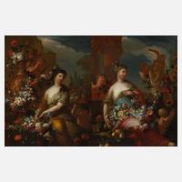 Gegenstücke als Allegorie auf den Sommer, je mit Darstellung einer leicht bekleideten jungen Göttin, einmal brünette Frau als Göttin der Blüte "Flora" bzw. blonde Schönheit als Göttin der Baumfrucht "Pomona", stets umgeben von Blumen und Früchte bringenden Putti, inmitten barocker Parkarchitektur, die Malerei besticht durch ihre heitere Gestimmtheit, der feinen Farbigkeit und besonders durch die minutiös mit spitzem Pinsel lasierend bis ins feinste Detail erfassten prächtigen Blumenbuketts und Früchtearrangements, Öl auf Leinwand, aus der Hochzeit des Künstlers um 1700, je links unten signiert "Gas. P. Verbruggen", rückseitig je undeutlich auf der Leinwand gestempelt einmal Versteigerungsetikett "Sotheby´s ..." und je Inventaretikett "Schloß Ricklingen ..." je mit Titel und Künstlerangabe "Caspar Peter Verbruggen 1664–1730", feine Craquelure, je doubliert und minimal restauriert, als Pendants im Goldstuckrahmen gerahmt, Falzmaße je ca. 50 x 39 cm. Künstlerinfo: auch Gasparo, Kaspar oder Caspar, Pedro, Pieter oder Peter Verbruggen, niederländischer Blumenmaler (1664 Antwerpen bis 1730 Antwerpen) Sohn und Schüler des Gaspar Peeter Verbruggen dem Älteren (1635–1681), um 1677 bereits Aufnahme als Meister in die Antwerpener St. Lukasgilde, ab 1680 bildet er Lehrlinge aus, ab 1691 Direktor der Akademie Antwerpen, 1691/92 erstmals Vorsteher der St. Lukasgilde, 1706–23 in Den Haag ansässig, hier Zusammenarbeit mit Matthäus Terwesten (1670–1757), ab 1708 Mitglied der Akademie Den Haag, der Künstler verdiente großen Reichtum, der ihm auf Grund eines unsteten und teuren Lebenswandels zerrann, 1723, verarmt, Rückkehr nach Antwerpen, hier Annahme einer Stellung als Dienstboote der St. Lukasgilde, der auf feinste Blumen- und Früchtemalerei spezialisierte Verbruggen unterhielt eine Werkstatt, in der unterschiedlich spezialisierte Mitarbeiter verschiedene Partien der Gemälde wie Figuren oder Architekturen malten, so stammen meist nur die Blütengirlanden und Obstarrangements von Verbruggen, der die Gemälde mit seinem Namen versah, Quelle: Thieme-Becker, Saur "Bio-Bibliographisches Künstlerlexikon", Wurzbach, Bénézit, Müller-Singer, Seubert, Müller-Klunzinger, Nagler und englische Wikipedia.