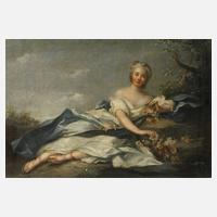 der französische Rokokomaler Jean-Marc-Nattier (1685 Paris bis 1766 ebenda) galt als galanter Maler von Damen der Hofgesellschaft Ludwig XV. am französischen Hof, so wurde er offizieller Portraitist der Familie d'Orléans und 1748 Portraitmaler am Hofe Ludwigs XV., in der Folge portraitierte er hochgestellte Persönlichkeiten des Königshauses und hob deren Bedeutung zusätzlich, indem er ihnen allegorische bzw. göttliche Bedeutungen zuordnete, bereits 1742 entstand das vorliegende Motiv, es zeigt die zweite Tochter Ludwig XV., Anne Henriette de Bourbon (1727–1752) als "Flora", die Göttin der Blüte, an einer Quelle in dämmriger Landschaft, stimmungsvolle, gering pastose Genremalerei in sublimer, kühler, frühklassizistischer Farbigkeit, freie Kopie nach Jean-Marc-Nattier, Öl auf Leinwand, 2. Hälfte 18. Jh., unsigniert, Craquelure, Keilrahmen etwas durchzeichnend, doubliert, restauriert, Farbplatzer, restaurierungsbedürftig, original gerahmt (rest.bed.), Falzmaße ca. 54,5 x 78,5 cm.