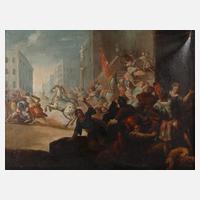 die Darstellung nimmt Bezug auf die mythische Geschichte aus der Gründungszeit Roms, nach der Gründung Roms herrschte der Überlieferung nach Frauenmangel in der Stadt, so ersann Romulus eine List und lud die Bewohner der umliegenden Städte zu einem Wettstreit, währenddessen römische Krieger über die nahezu unbewaffneten Gäste herfielen und alle unverheirateten Frauen, deren sie habhaft werden konnten, verschleppten und mit Römern verheirateten, barocke Genremalerei, Öl auf Leinwand, um 1700, unsigniert, alt hinterlegte Leinwand, restaurierungsbedürftig, im schönen neuzeitlichen Rahmen, Falzmaße ca. 76 x 101 cm.