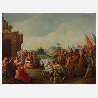 Darstellung der biblischen Geschichte um den Hirtenjungen David, dieser sollte seinen, im Heer gegen die Philister kämpfenden Brüdern Essen bringen, dabei vernahm er den Hohn des hünenhaften Vorkämpfers der gegnerischen Philister, Goliat, was David in Wut versetzte, das folgende Geschehen schildert die Bibel im ersten Buch Samuel des Alten Testaments (1 Sam. 17,48–51) „... Als der Philister [Goliat] weiter vorrückte und immer näher an David herankam, lief auch David von der Schlachtreihe [der Israeliten] aus schnell dem Philister entgegen. Er griff in seine Hirtentasche, nahm einen Stein heraus, schleuderte ihn ab und traf den Philister an der Stirn. Der Stein drang in die Stirn ein und der Philister fiel mit dem Gesicht zu Boden. So besiegte David den Philister mit einer Schleuder und einem Stein; ... Dann lief David hin und trat neben den Philister. Er ergriff sein Schwert, zog es aus der Scheide, schlug ihm den Kopf ab und tötete ihn. Als die Philister sahen, dass ihr starker Mann tot war, flohen sie. ...", die abgebildete Szene zeigt den Triumphzug der Israeliten mit David auf einem von zwei weißen Rössern gezogenen Prunkwagen, beim Einzug in die biblische Stadt Gob, vor der junge musizierende Frauen die Krieger empfangen, in den Händen hält David den abgeschlagenen Kopf des Goliat und dessen Schwert, lasierende, barocke Genremalerei, Öl auf Holzplatte, 1. Hälfte 18. Jh., unsigniert, etwas Craquelure und farbschwundrissig, Farbaufwölbungen und -platzer, Malgrund verzogen und mehrfach gebrochen, alte Hinterlegungen und Retuschen, restaurierungsbedürftig, gerahmt, Falzmaße ca. 48,5 x 63,5 cm.