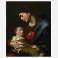 Halbfigurenbildnis einer jungen Frau, ihr schlafendes gefatschtes Kind im Arm haltend, das sowohl in Farbigkeit als auch Gestus an eine Darstellung Mariens mit dem Jesuskind erinnernde Motiv entbehrt jeglicher Heiligensymbolik und zeigt eine innige Zugewandtheit von Mutter und Kind, anrührende, lasierende, partiell pastose Malerei mit sehr schönem Licht, Öl auf Leinwand, wohl 18. Jh., unsigniert, Craquelure, alt doubliert, gering restauriert, minimal reinigungsbedürftig, im prächtigen, alten Goldstuckrahmen gerahmt, Falzmaße ca. 73 x 58 cm.