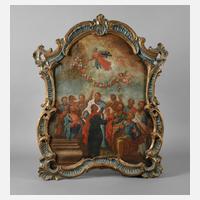 Darstellung der mystischen Aufnahme Mariens in den Himmel, während die Apostel andächtig am offenen Sarkophag verharren, weisen sie erstaunt zum Himmel, wo Maria, von Engeln mit Blütengirlanden begleitet, ihren Blicken entschwebt, gering pastose, religiöse Genremalerei, unsigniert, rückseitig auf dem geschwungen gearbeiteten Spannrahmen in Blei datiert "Anno 1739", Craquelure, Fehlstellen in der Leinwand, restaurierungsbedürftig, im prächtigen Neobarockrahmen (bestoßen) gerahmt, Falzmaße ca. 78 x 60 cm.