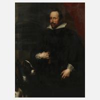 Dreiviertelbildnis eines Herrn in mittleren Jahren, in schwarzer spanischer Amtstracht mit Orden vom Goldenen Vlies, neben einer Dogge vor Säule und Stoffdraperie, das Gemälde zeigt den Pfalzgrafen Wolfgang Wilhelm von Pfalz-Neuburg, Pfalzgraf bei Rhein, Herzog in Bayern und zu Jülich, Kleve und Berg, Graf zu Veldenz, Sponheim, Mark, Ravensberg und Moers, Herr in Ravenstein (1578 Neuburg an der Donau bis 1653 Düsseldorf), der als Sohn des bekennenden Lutheraners Philipp Ludwig von Pfalz-Neuburg geborene Wolfgang Wilhelm wechselte auf Grund machtstrategischer Erwägungen 1613 zum Katholizismus und trat der katholischen Liga bei, daraufhin verlieh im der Großmeister des Ordens, Philipp IV. von Spanien, 1615 das "Goldene Vlies" und ernannte ihn 1625 zum Granden des Spanischen Königreichs, der als reisefreudiger Kunstmäzen und passionierter Jäger in die Geschichte eingegangene Reichsfürst züchtete auch Jagdhunde und speziell Doggen, mit einer seiner Doggen stand er um 1629 Antonis van Dyck (1599–1641) Modell für ein Portrait, welches hier als Ausschnitt kopiert wurde, das Original bewahrt die Staatsgalerie Neuburg, feine Erfassung der Physiognomie und der Hände des Dargestellten, gleichwie feine Wiedergabe des Hundeportraits, Öl auf Leinwand, wohl 17. Jh., unsigniert, Craquelure, doubliert, restauriert, Provenienz: süddeutscher Adelsbesitz, alt gerahmt, Falzmaße ca. 130,5 x 100 cm.